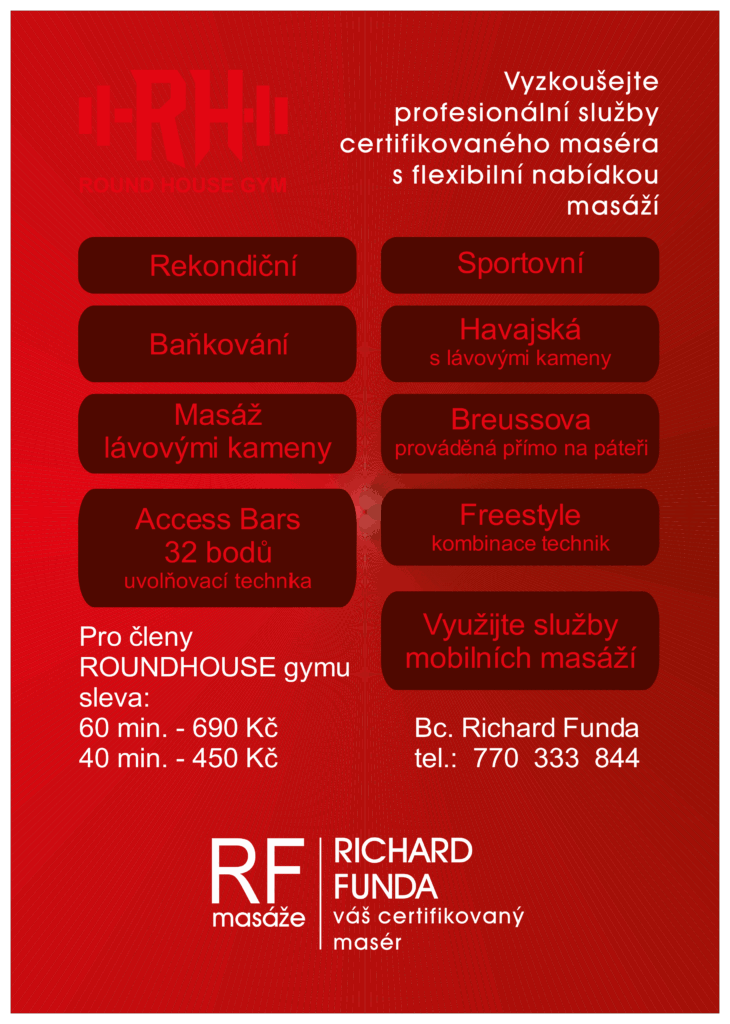 Profesionální péče, která kombinuje fyzio přístup, sportovní masáž a moderní techniky pro regeneraci. Naši maséři pracují přímo s členy Roundhouse Gym, znají potřeby sportovců i běžných lidí a přesně vědí, jak ulevit od bolesti zad, přetížených svalů nebo únavy po tréninku.